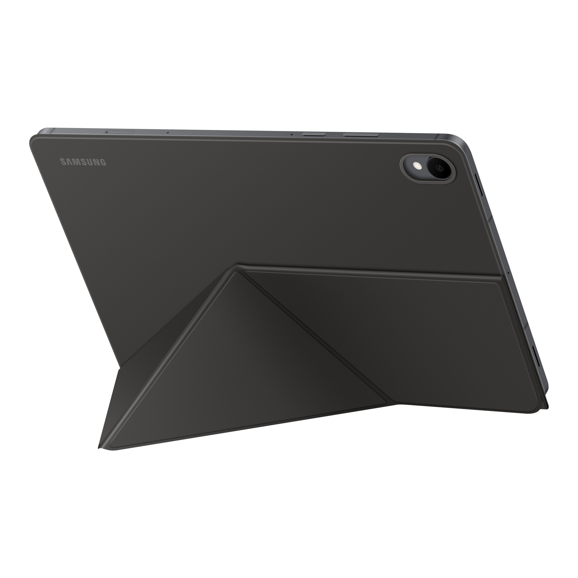 Coloca tu Galaxy Tab en posición vertical tanto en modo retrato como paisaje con la funda Book Cover. La solapa delantera se pliega y sostiene la tablet por detrás, creando una base estable que mantiene la pantalla firme en el ángulo que elijas.