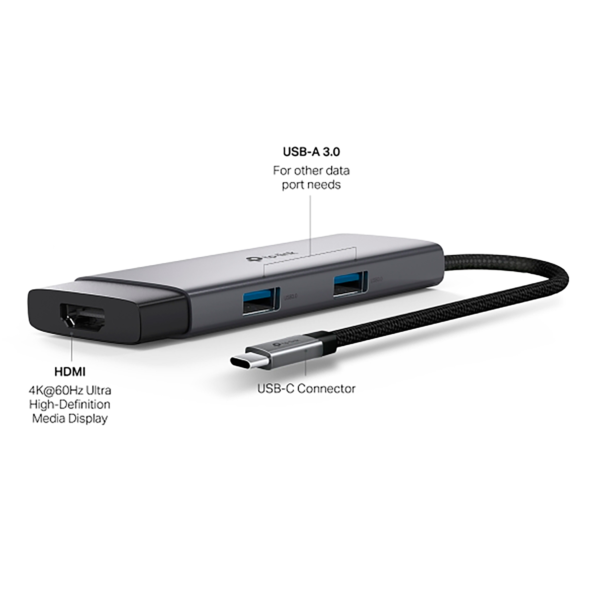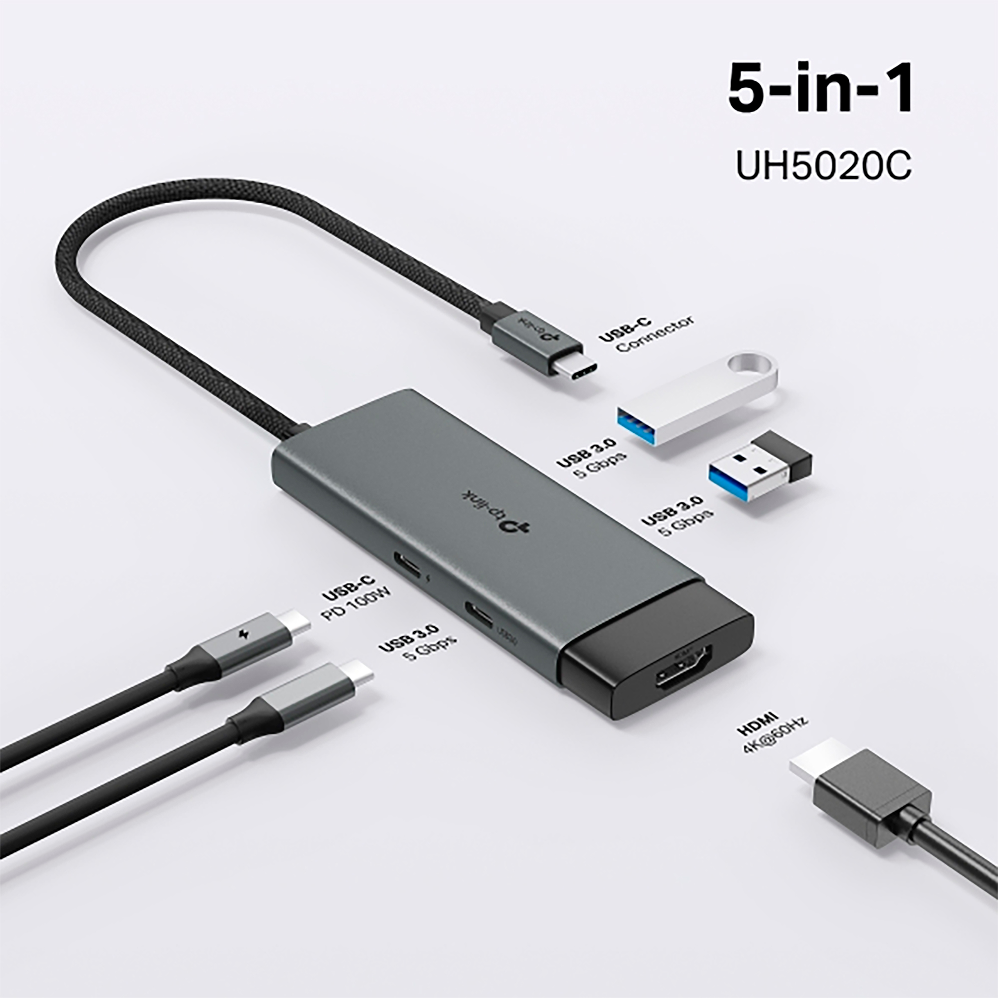 Hub 5 en 1 USC C. UH5020C convierte un único puerto USB C en 5 puertos con: 1 puerto HDMI 4K a 60Hz , 1 puerto 100 W Power Delivery, un puerto USB C y dos puertos USB A.