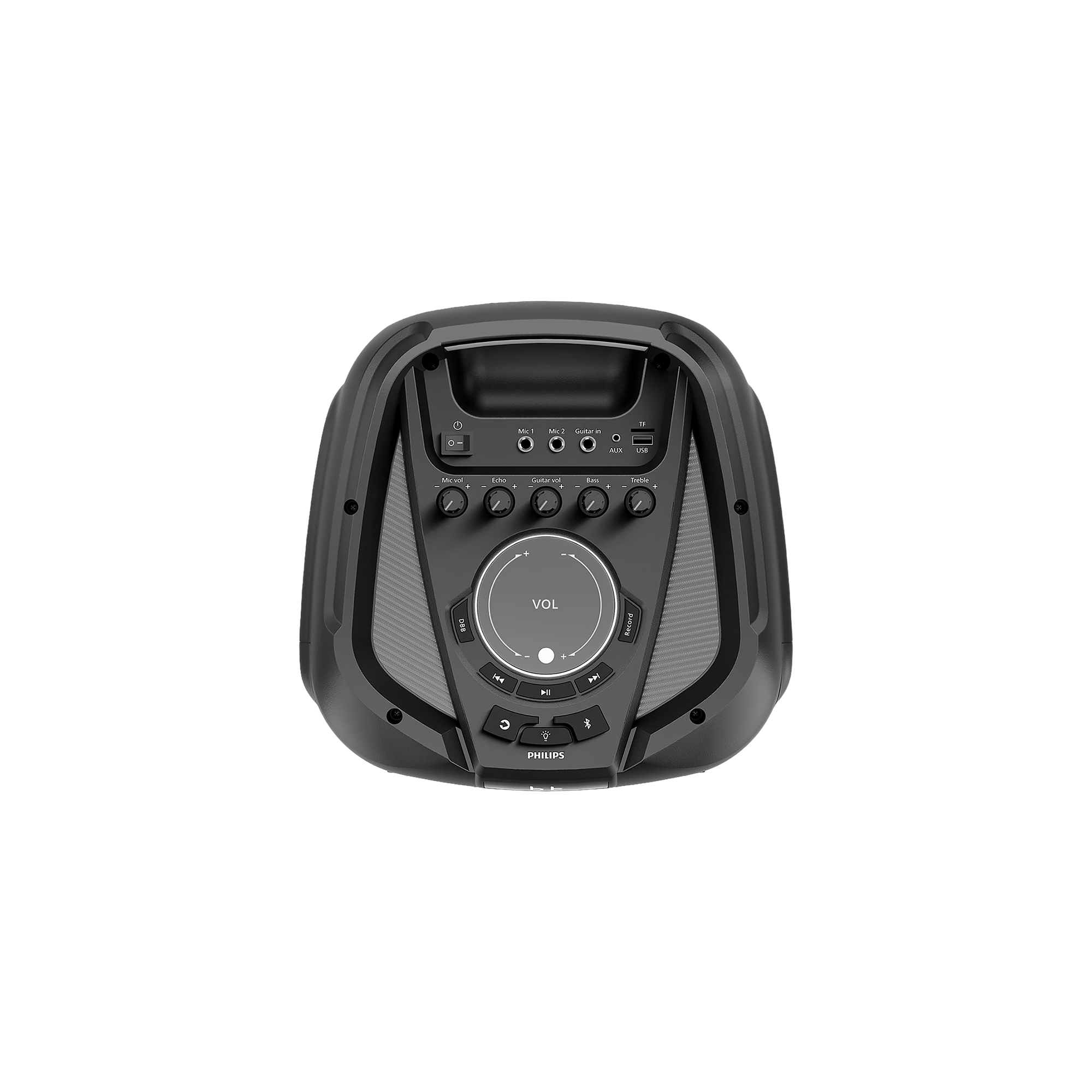 El mango de transporte incorporado te permite colocar fácilmente el parlante en la posición perfecta. Lleva el ritmo a la casa de tus amigos y configúralo en cualquier habitación. También puedes saltar canciones y subir el volumen directamente desde el parlante o mediante el control remoto.