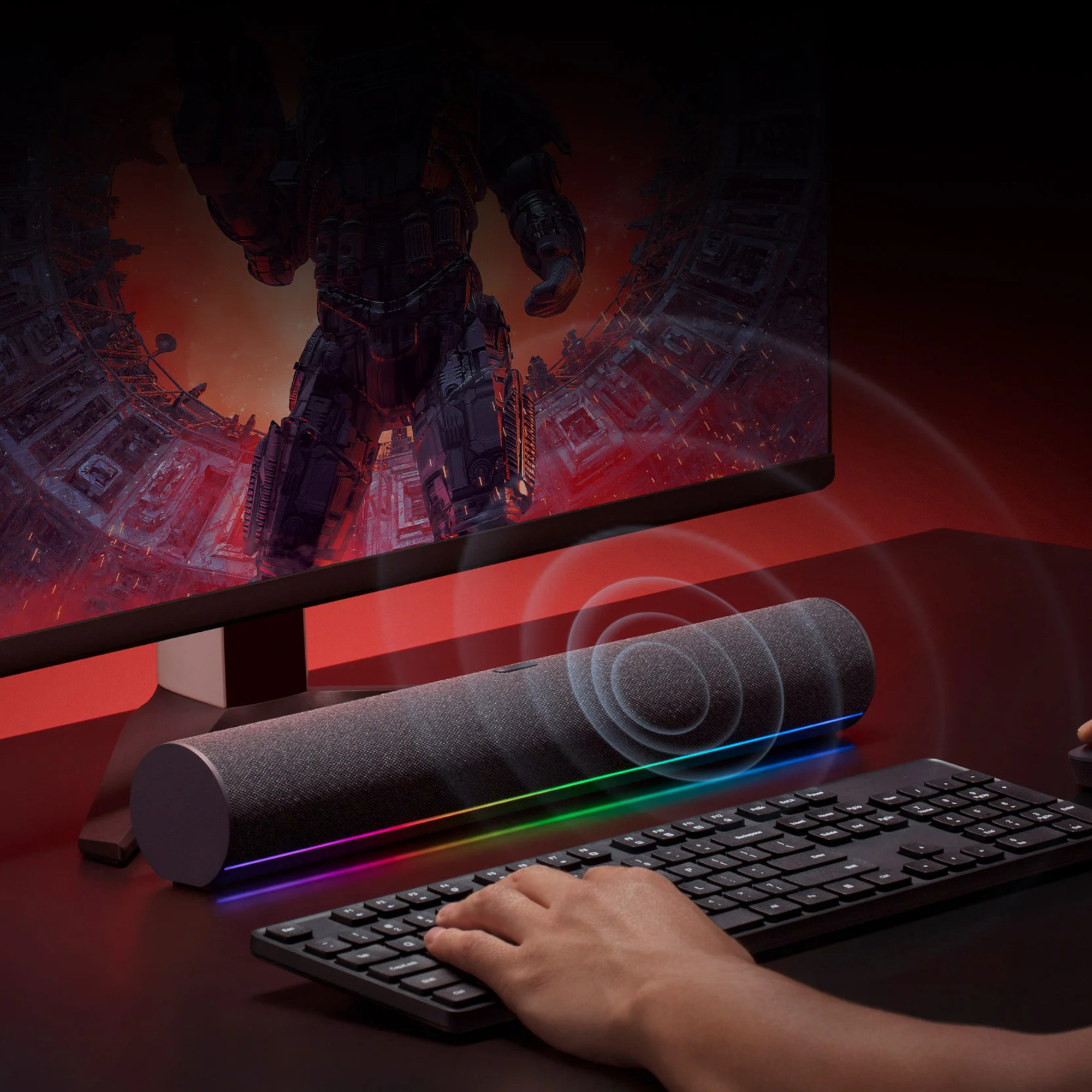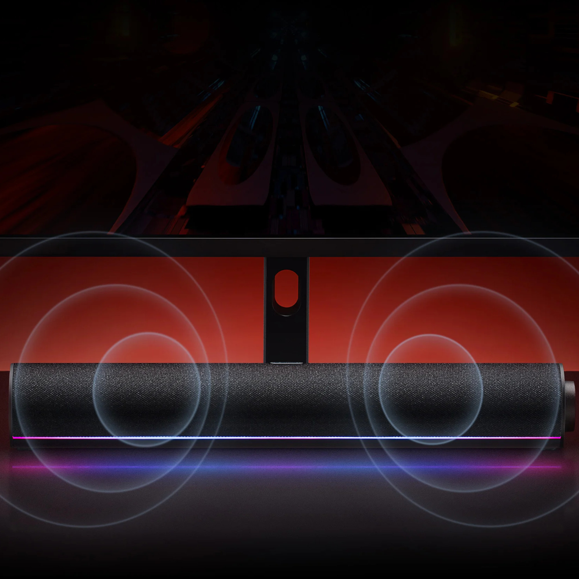 16 LED RGB alineados en la parte inferior forman una atractiva cinta de luz. Cambia entre 5 modos* y personaliza tu escritorio y crea el ambiente que prefieras en la habitación.