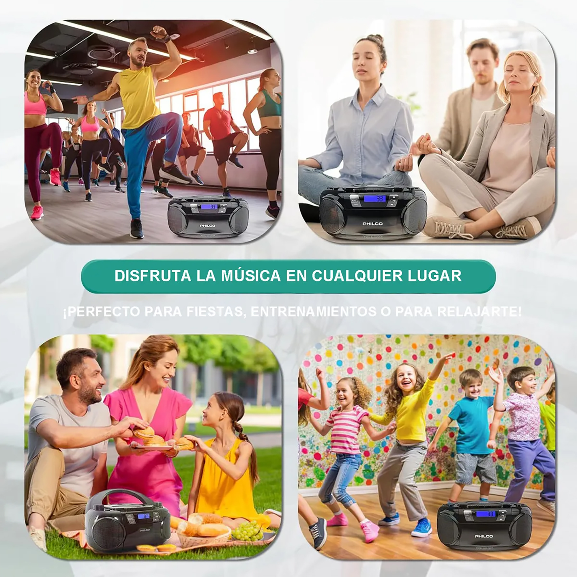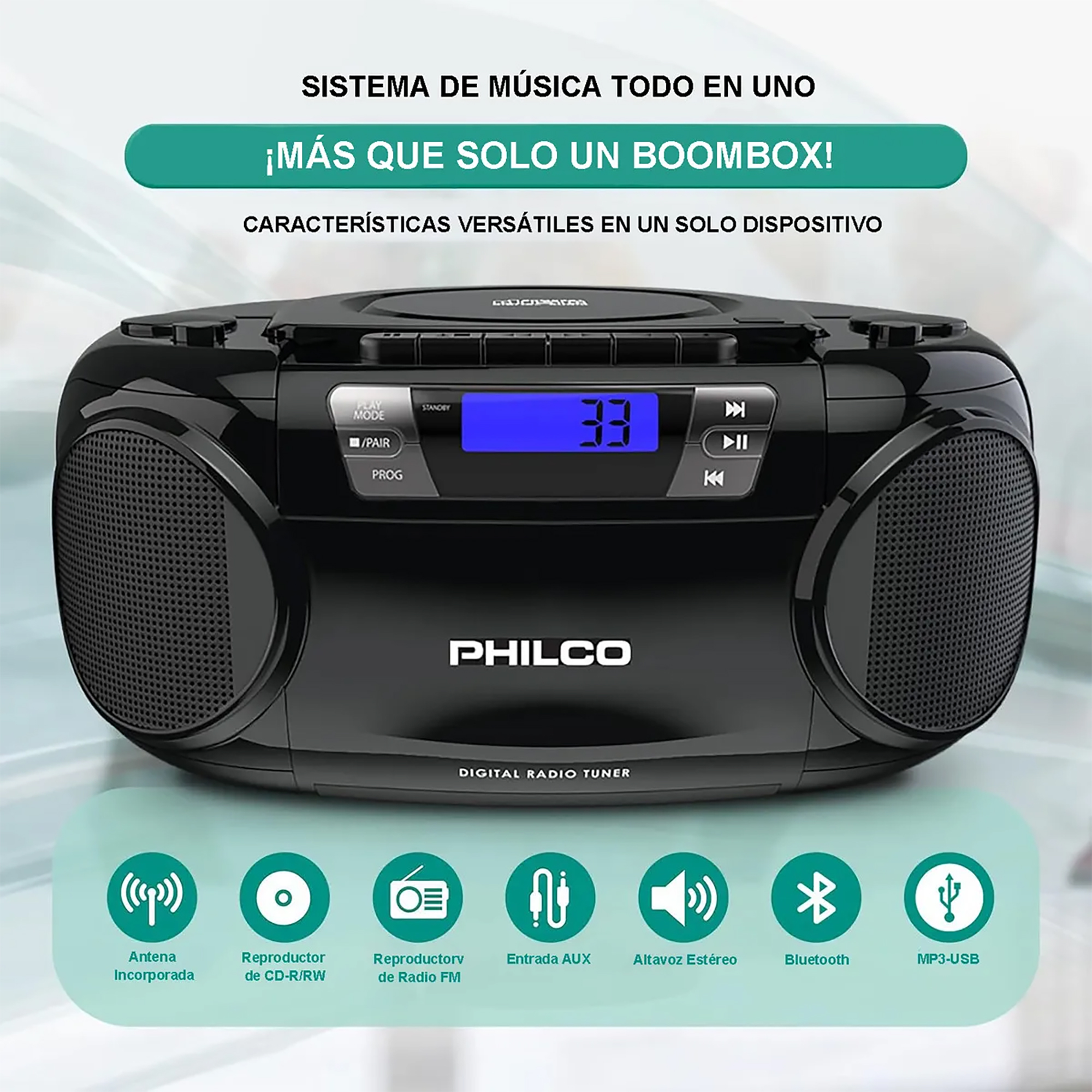 Si eres un amante de la música y buscas un dispositivo versátil y fácil de usar, el Radio Boombox BT PJC7000BT de Philco es la opción perfecta para ti. Con su combinación de radio FM, conectividad BLUETOOTH y reproductor de CD y MP3, te permite disfrutar de tus canciones favoritas en diferentes formatos y con la comodidad de la conectividad inalámbrica.